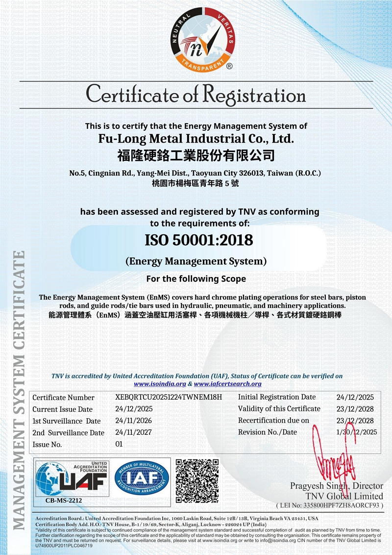 We are proud to announce that Fu-Long Metal Industrial Co., Ltd. has officially been certified for conforming to the requirements of ISO 50001:2018. This Energy Management System (EnMS) certification covers our hard chrome plating operations for steel bars, piston rods, and guide rods/tie bars used in hydraulic, pneumatic, and machinery applications. Registered on December 24, 2025, this milestone underscores our commitment to optimizing energy efficiency and advancing sustainable manufacturing practices.